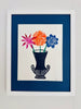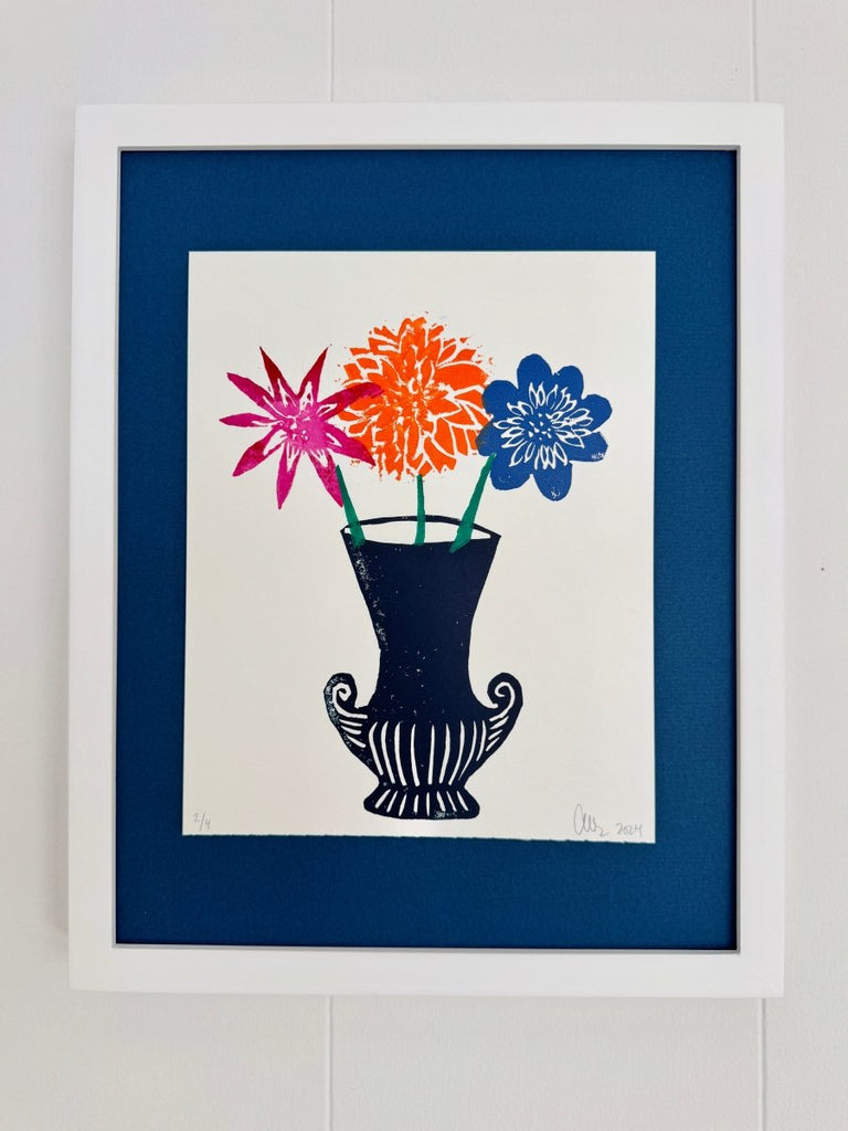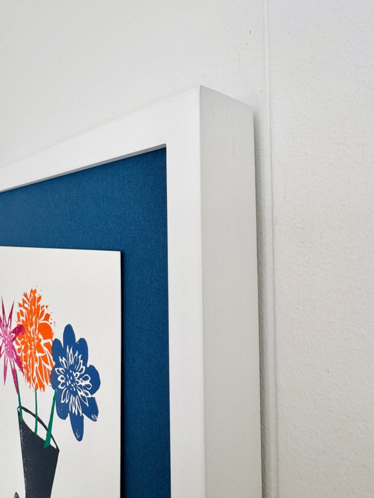 • Framed in chunky white wood frame on navy blue mat (white matboard available upon request), ready to be hung.