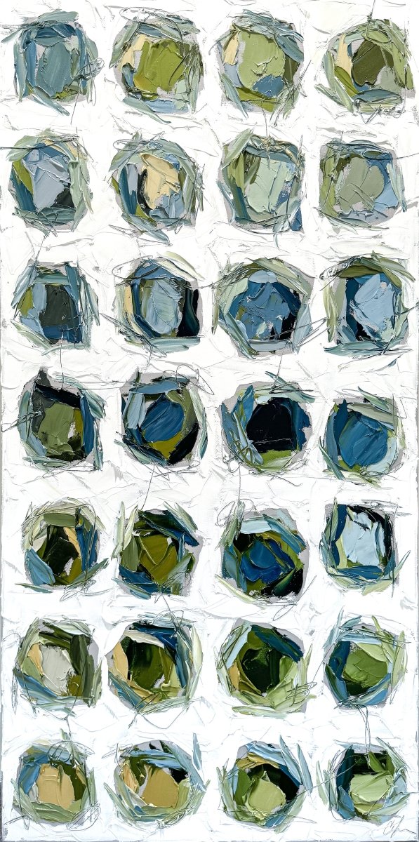 She pushes this idea further by deconstructing her view into simpler elements and destroying the obvious while simultaneously including authentic moments to convey more elaborate ideas. She is intrigued with contrasting interactions; simple vs. complex, classic vs. modern, clarity vs. ambiguity, order vs. chaos, depth vs. shallowness, negative space vs. positive space, etc. She uses texture and line to define form by sculpting oil paint with her palette knife and pencil while scratching away paint with various tools, aka, Sgraffito. All of these elements combined with her creativity and skill bring to life a painting that displays imperfect beauty in a very unique style. She finds the most freedom of expression through various subject matter but is most known for her floral still lifes, waterlilies, botanicals, and abstracts. However, not to place limits on herself, she at times enjoys experimentation with other subjects while working with several mediums and tools at times...because...