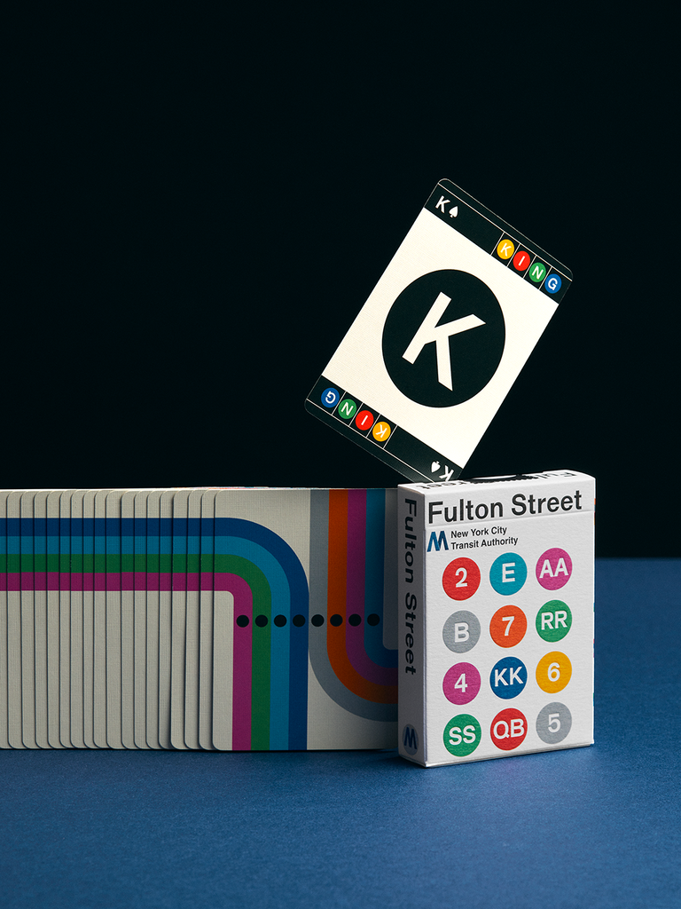 Fulton Street Playing Cards is a love letter to the amazing graphic design of the New York Metropolitan Transportation Authority. By “cropping into” the curves so eloquently designed by Vignelli, these cards provide a back design that encapsulates the kinetic energy of transit in The Big Apple.