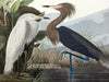 Audubon drew both the birds and the background in Florida in April 1832. When he first saw them in the Keys, he puzzled at their coloration: “Some of them were as white as driven snow, the rest of a delicate purplish tint, inclining to grey on the back and wings, with heads and necks of a curious reddish colour. Males and females there were, but they were all of one species…” He concluded that those with white plumage were immature birds. He was incorrect, since in this species, coloring depends on the individual and has no relation to either age or sex. It is dimorphic and displays two color phases, one white, the other purplish blue. The birds illustrated here are both adults.