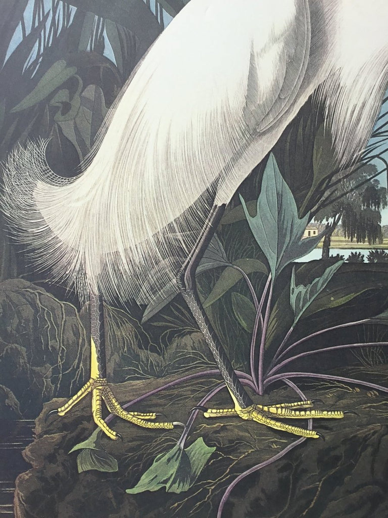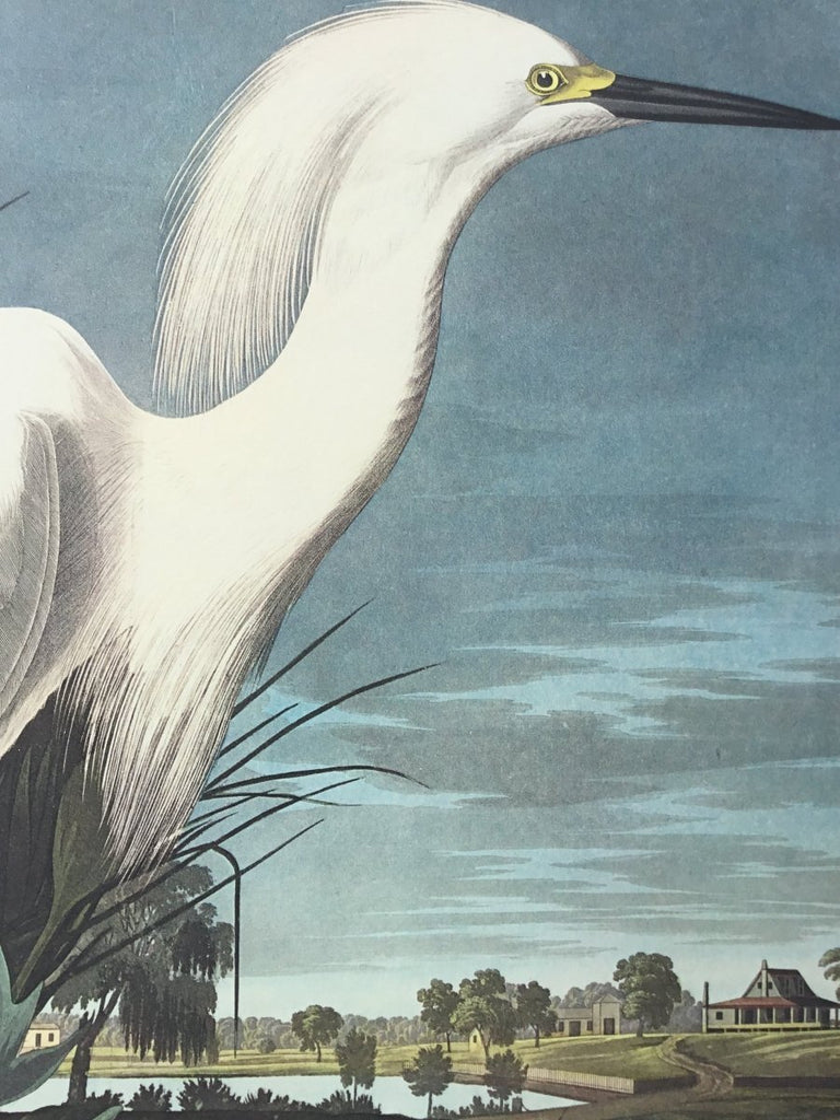 In the early spring of 1832, Audubon and his assistant George Lehman stayed at the home of John Bachman in Charleston, South Carolina. Audubon wrote of the thousands of snowy egrets that had arrived there by March 25 and “were seen in the marshes and rice fields, all in full plumage.” Soon he painted this magnificent egret, while Lehman added the landscape of a rice plantation in the Carolina low country.