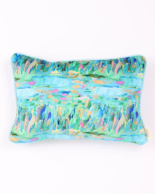 This luxurious pillow is hand crafted from shimmering velvet that catches the light with every movement, creating a soft, iridescent glow. Its design is elegantly intricate, featuring a pattern on both sides from the original painting called La Mer. The combination of velvety softness, the dual-sided design and baby blue cording makes this pillow a statement piece, inviting both comfort and sophistication into any space. Made in the US. Each design will vary in their own unique creation.