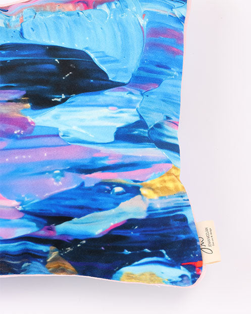 This luxurious pillow is hand crafted from shimmering velvet that catches the light with every movement, creating a soft, iridescent glow. Its design is elegantly intricate, featuring a pattern on both sides from the original painting called The Dela. The combination of velvety softness and the dual-sided design makes this pillow a statement piece, inviting both comfort and sophistication into any space. Made in the US. Each design will vary in their own unique creation.