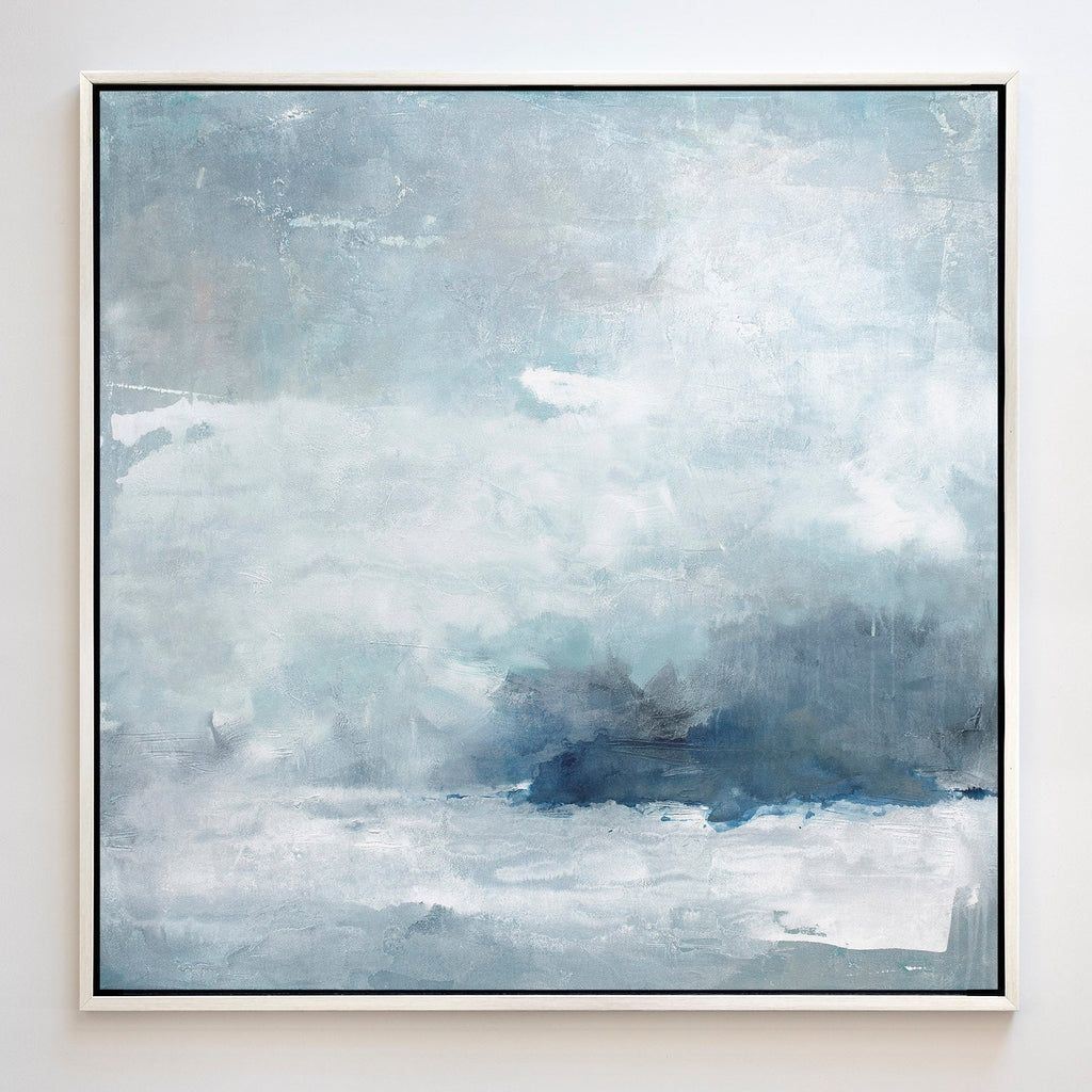 An abstracted coastal-inspired painting, this piece draws you in through the mystery of a misty landscape.