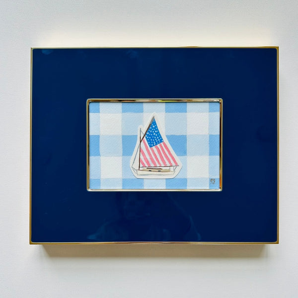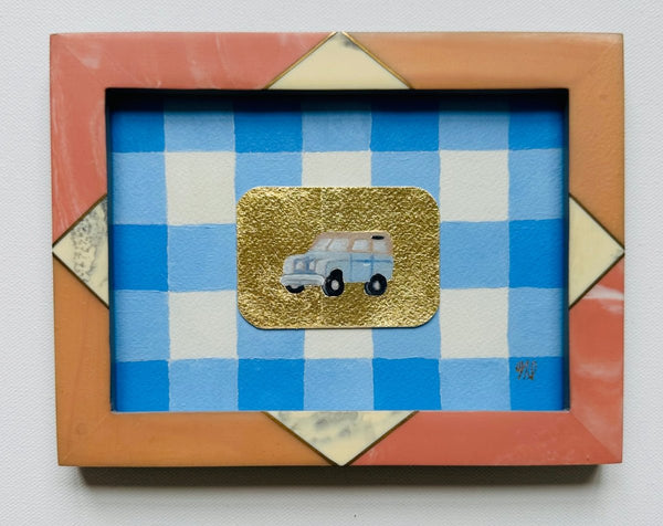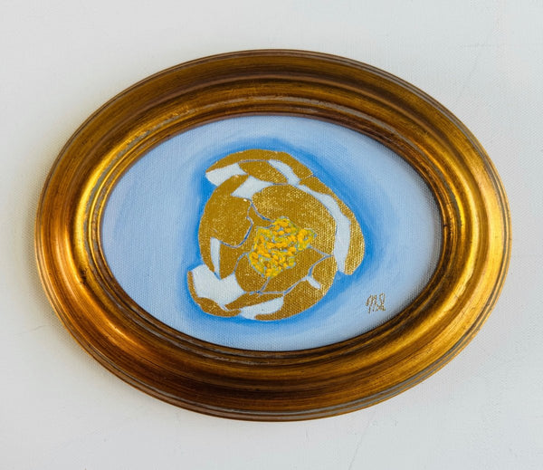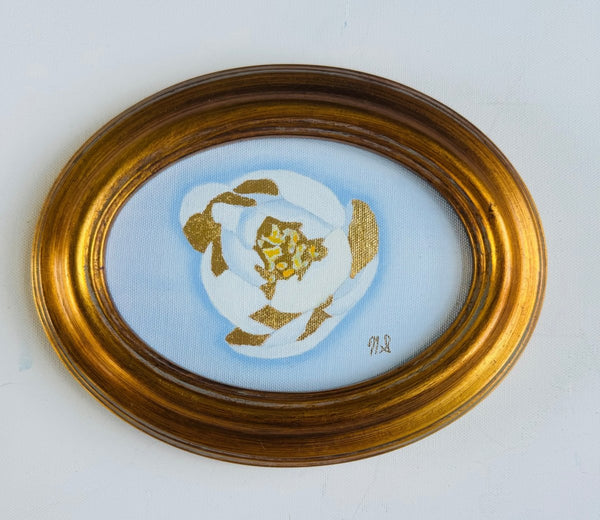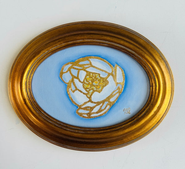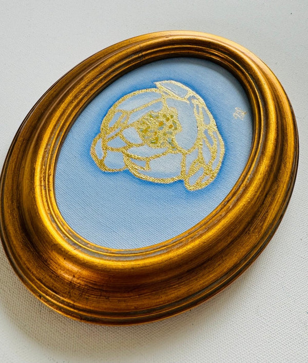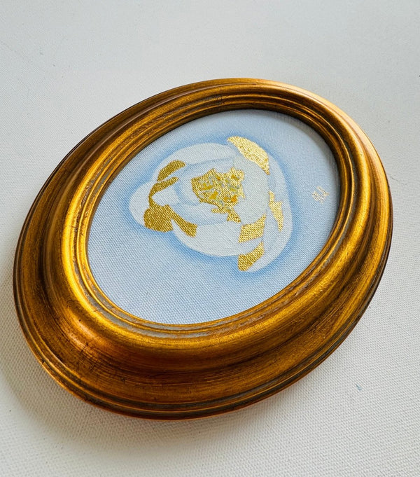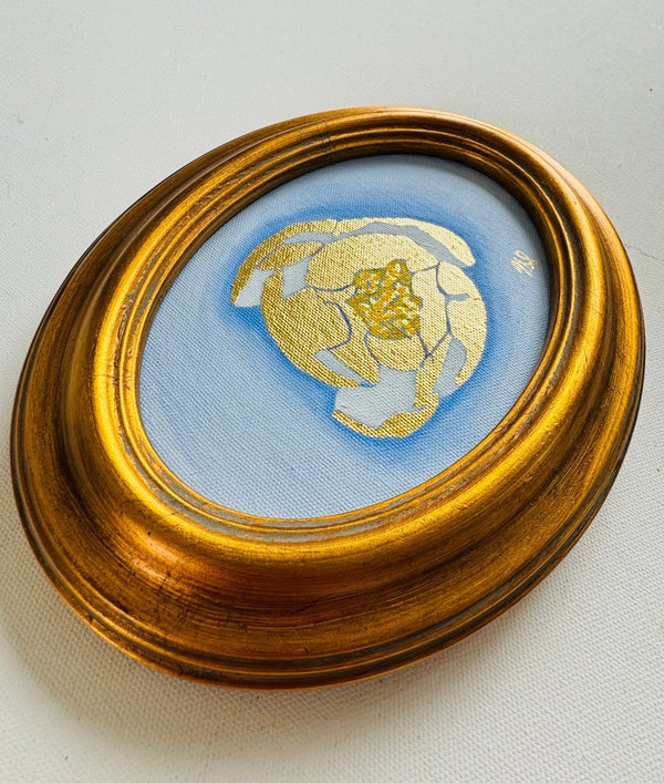 She employs a variety of paint mediums alongside 24K gold leaf, occasionally integrating collaging into her process. Notably, her signature styles include large-scale abstract coastal paintings embellished with 24K gold leaf, making for striking statement pieces. Additionally, she creates smaller works featuring painted objects layers with paper, designer fabric, and wallpaper. These artwork, set in unique frames with hand-painting matting, are ideal for adorning gallery walls or shelves.