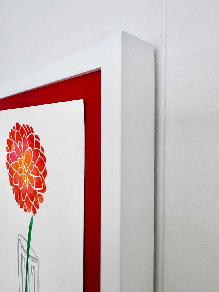 - Framed in chunky white wood frame on red mat (white matboard available upon request), ready to be hung.