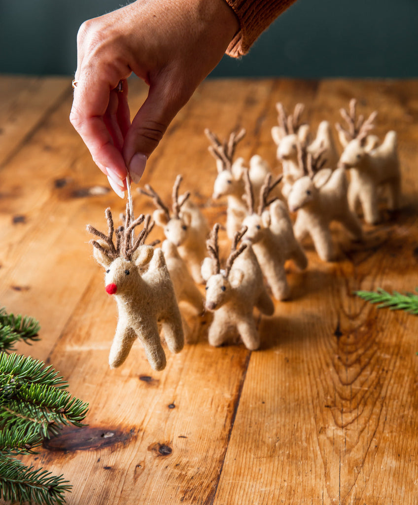 Bring Santa’s sleigh team to your tree! These wool felt reindeer ornaments feature soft antlers, sweet expressions, and classic brown noses—except for our star reindeer, Rudolph, who’s sporting his signature red nose to guide the way! Handcrafted with care, each reindeer is perfect for adding a touch of woodland whimsy to your holiday decor. Whether displayed solo or as a merry little herd, these handcrafted ornaments are sure to light up your holiday season.