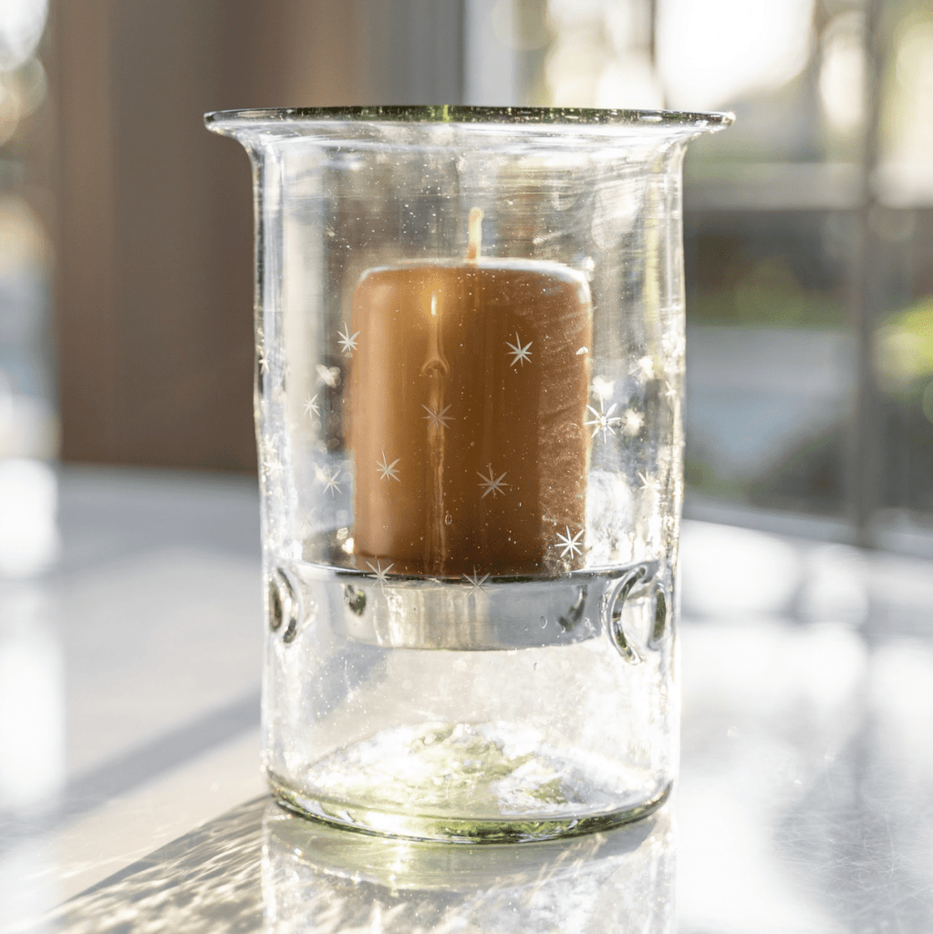Candlelight adds a little something extra to every gathering and the twinkle of our hand-etched stars is something to behold. Our hurricanes are made with mouth-blown, recycled glass. Display as is, or personalize for any gathering by placing small decor like moss, pebbles, and ornaments below the pewter candle tray.