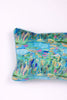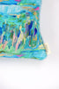 This luxurious pillow is hand crafted from shimmering velvet that catches the light with every movement, creating a soft, iridescent glow.  Its design is elegantly intricate, featuring a pattern on both sides from the original painting called La Mer.  The combination of velvety softness, the dual-sided design and baby blue cording makes this pillow a statement piece, inviting both comfort and sophistication into any space.  Made in the US. Each design will vary in their own unique creation.
