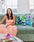 This luxurious 20 x 20 pillow is hand crafted from shimmering velvet that catches the light with every movement, creating a soft, iridescent glow. Its design is elegantly intricate, featuring a pattern on one side from the original painting inspired from the original painting called Our Little Angel. The rich teal is on the back of the pillow as well as the teal cording that trims the edges provides a refined contrast, enhancing the pillow's opulence. The combination of velvety softness, the intricate design, and the delicate gold trim makes this pillow a statement piece, inviting both comfort and sophistication into any space. Made in the US. Each design will vary in their own unique creation.