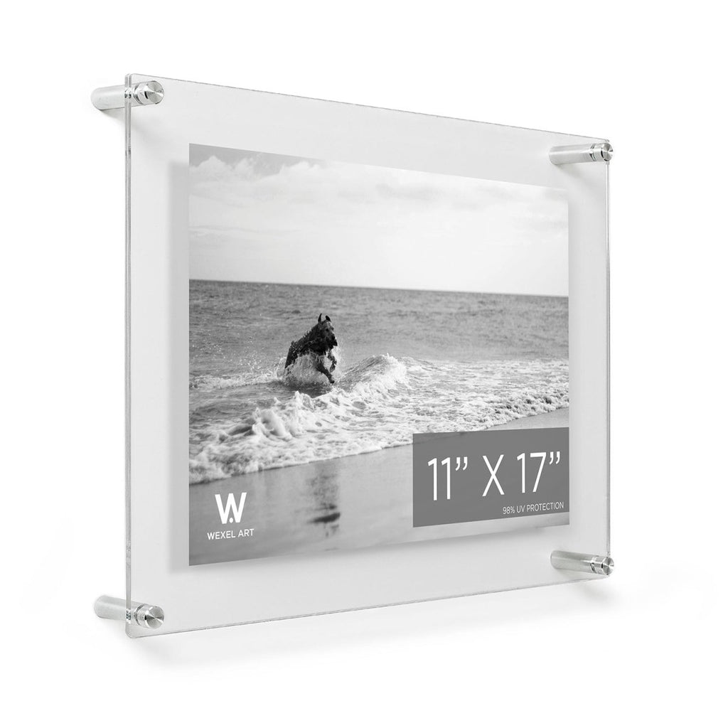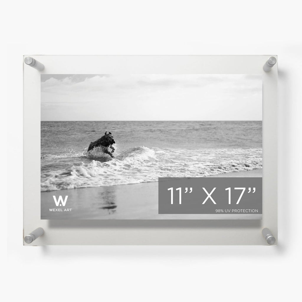 Float your artwork and posters off the wall while fully enclosing your art in between two 15x21" panels of acrylic. Ideal for 11"x17" posters and art. Wexel's acrylic is mar-resistant and flame polished giving your frame the perfect finishing touch. When you want to change out your display, just unscrew the caps on the hardware and lift off the acrylic.