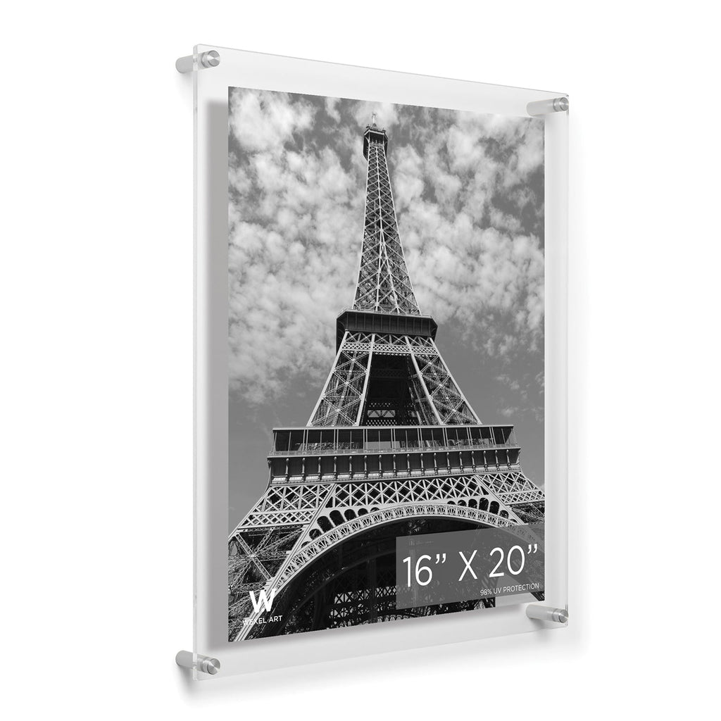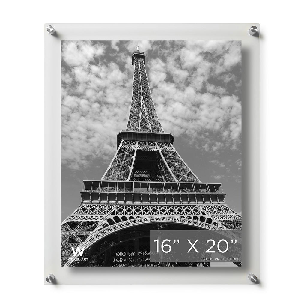 Float your artwork and posters off the wall while fully enclosing your art in between two 19x23" panels of acrylic. Ideal for photos and art up to 16x20". Looks great with 11x14" photos, leaving an elegant 4" clear border. Wexel's acrylic is mar-resistant and flame polished giving your frame the perfect finishing touch. When you want to change out your display, just unscrew the caps on the hardware and lift off the acrylic. See our tips for hanging your art here.