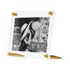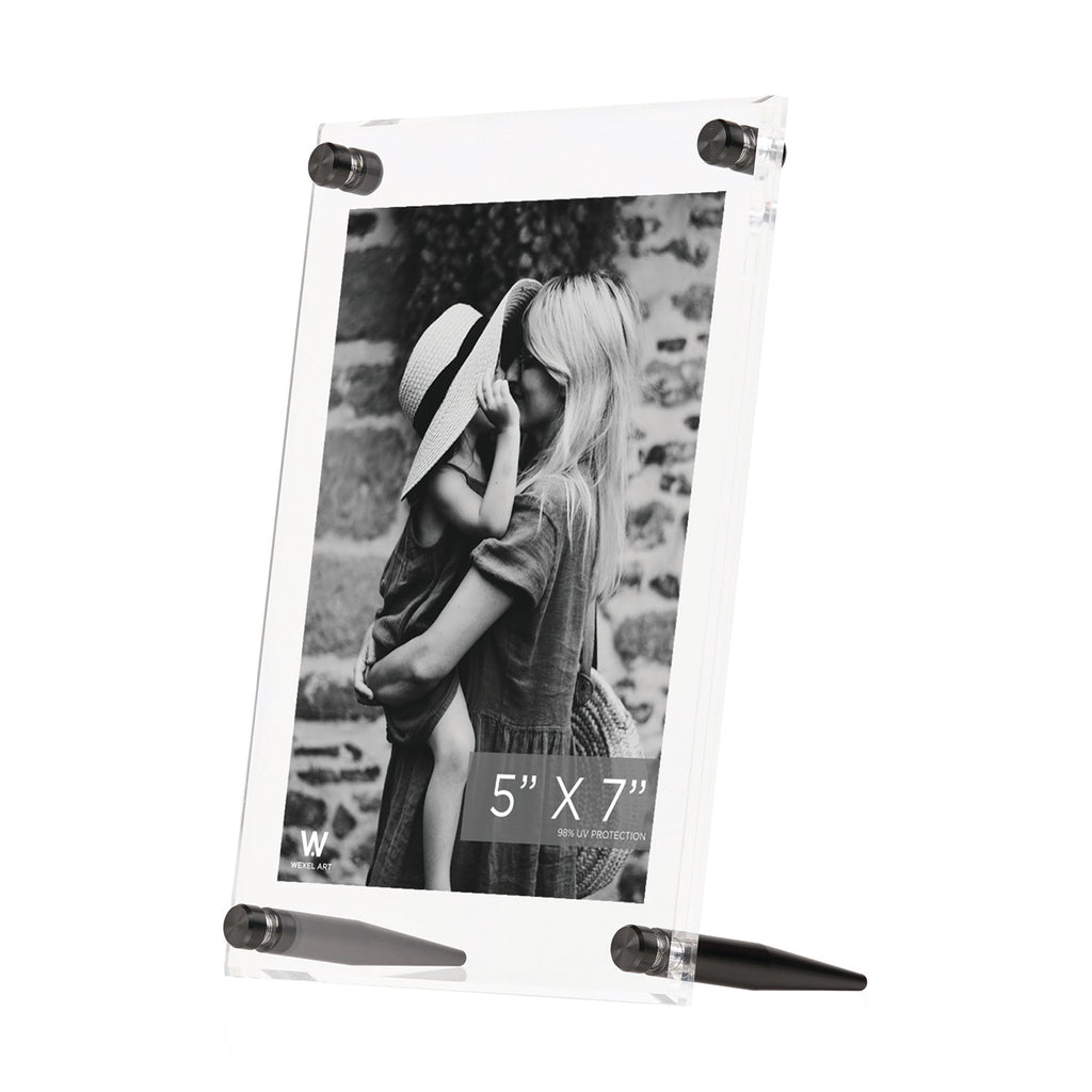 Stunning, Diamond polished bevel edge acrylic tabletop frame. Float photos up to 5x7" between 9x7" panels. Stands vertically or horizontally.