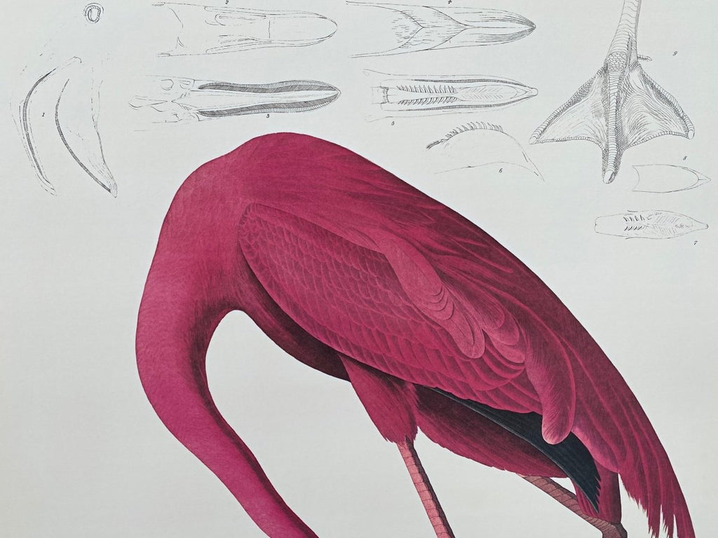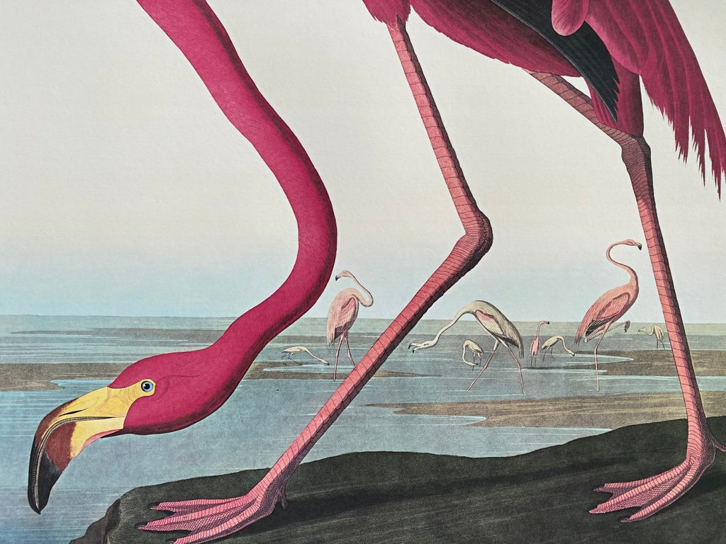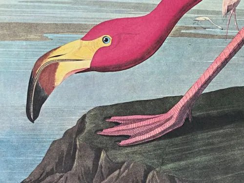 Audubon saw several flocks of American flamingos in the Florida Keys in 1832, and while anxious to obtain a specimen from which to make a painting, he was never able to shoot one. During a stay in London, he wrote repeatedly to his friend John Bachman in Charleston, South Carolina, asking for a specimen. In a letter dated October 31, 1837, he said: “As to flamingos their Eggs &c I fear this is up for me; and this proves to me now that I was a great fool not to have gone to Cuba, or sent a person there expressly….”