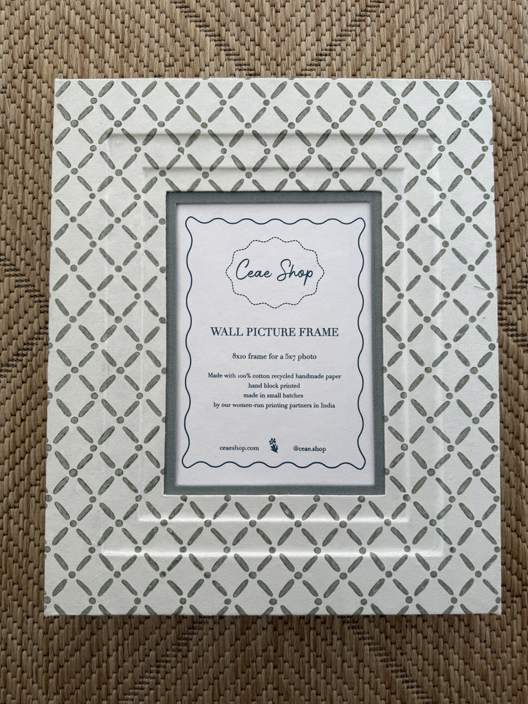 Our picture frames are made of recycled cotton paper that is hand block printed, then wrapped by Master Artisans in India. The overall frame size is 8x10 and holds a 5x7 photo.