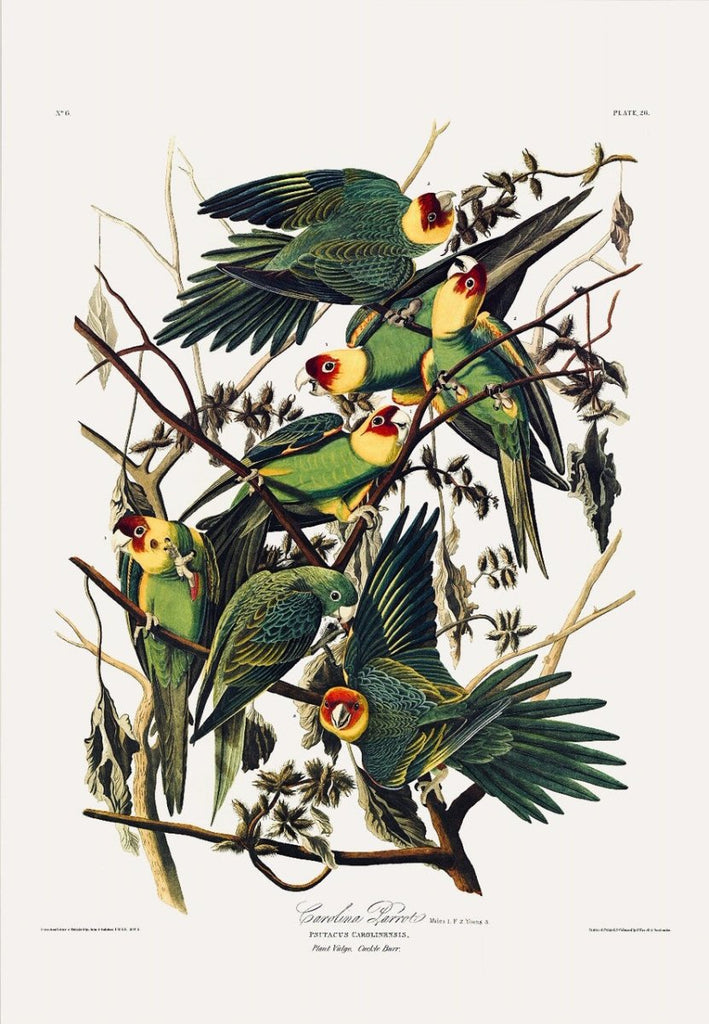 "The woods are the habitation best fitted for them, and there the richness of their plumage, their beautiful mode of flight, and even their screams, afford welcome intimation that our darkest forests and most sequestered swamps are not destitute of charms." So wrote John James Audubon about the stunning Carolina Parrot. In later years he was to write: "Our Parakeets are rapidly diminishing in number, and in some districts, where twenty-five years ago they were plentiful, scarcely any are now to be seen." Sadly, this beautiful bird, which ranged from Texas to New York, is now extinct.