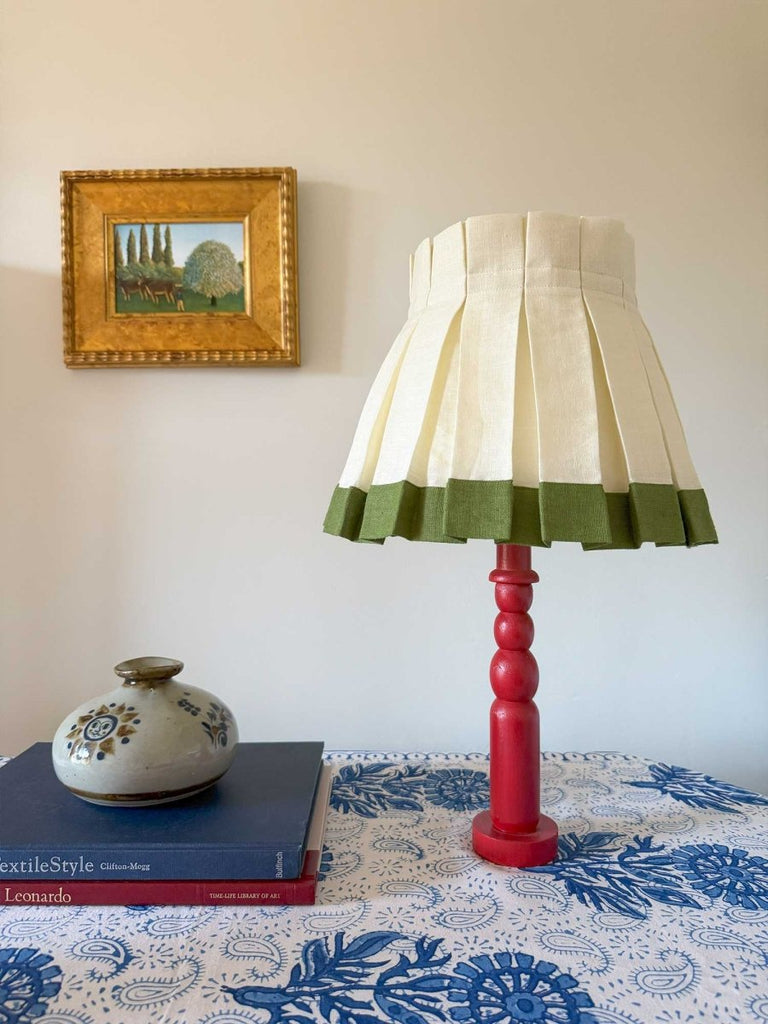 Our colorblock lampshade showcases a vibrant wide band at the bottom, infusing our iconic box pleat design with captivating visual intrigue.