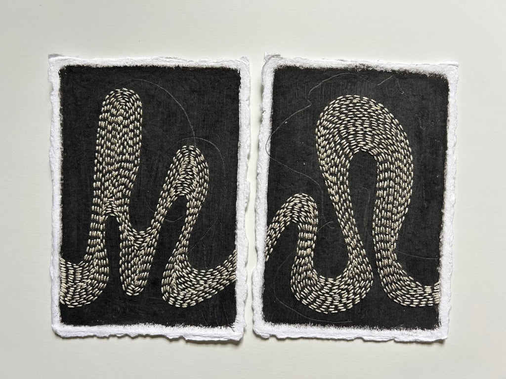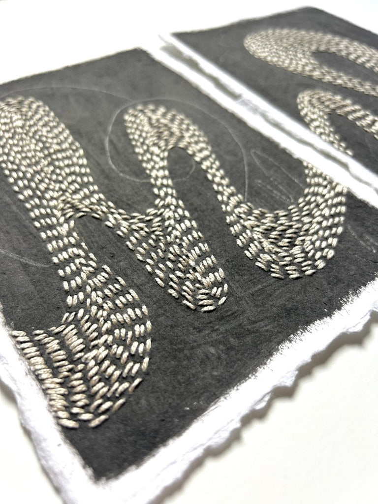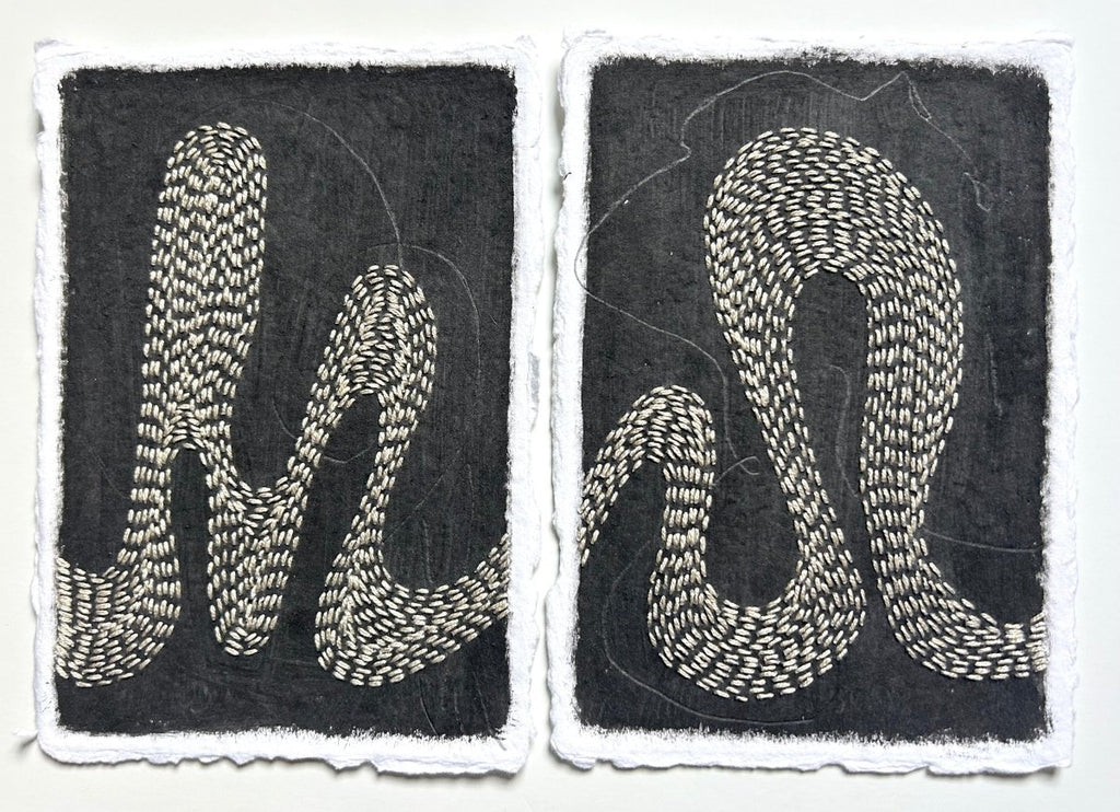 - Medium: Acrylic paint on handmade paper with embroidered cotton thread.