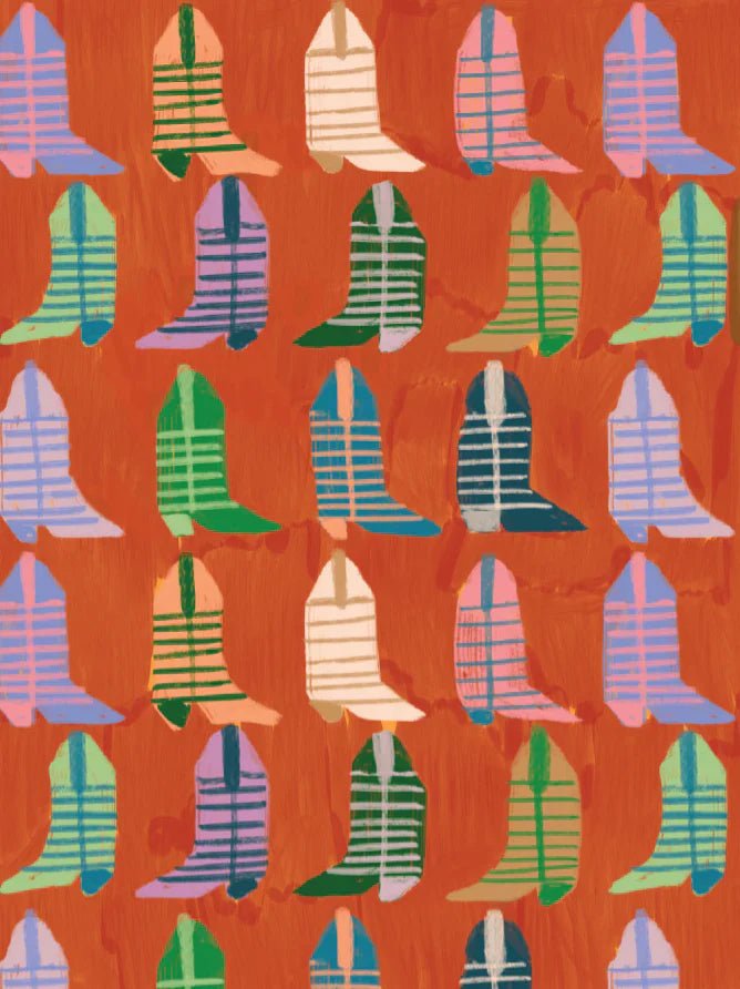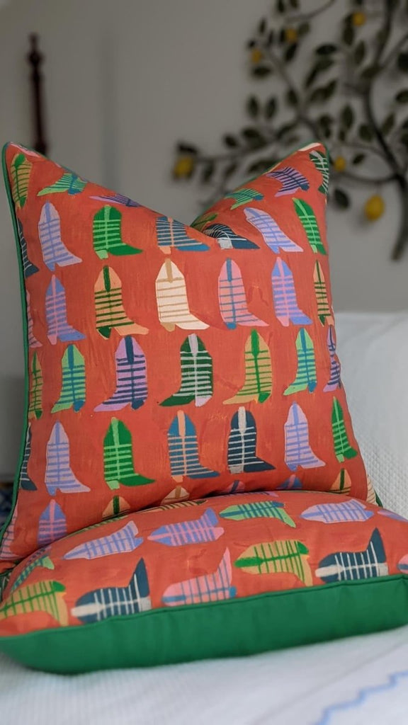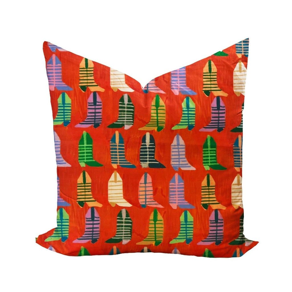 One decorative pillow cover featuring a boot design on home decor weight fabric by artist Lulie Wallace.