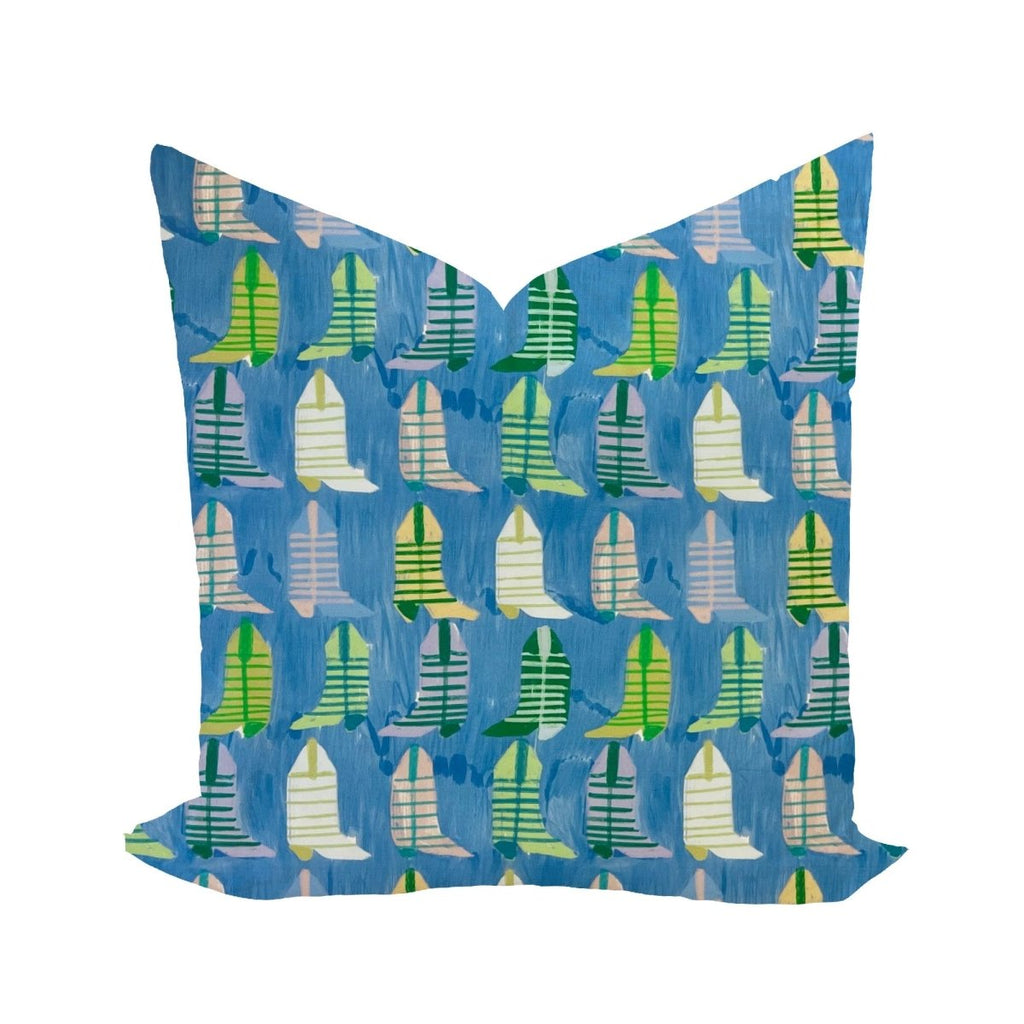 One decorative pillow cover featuring a boot design on home decor weight fabric by artist Lulie Wallace.