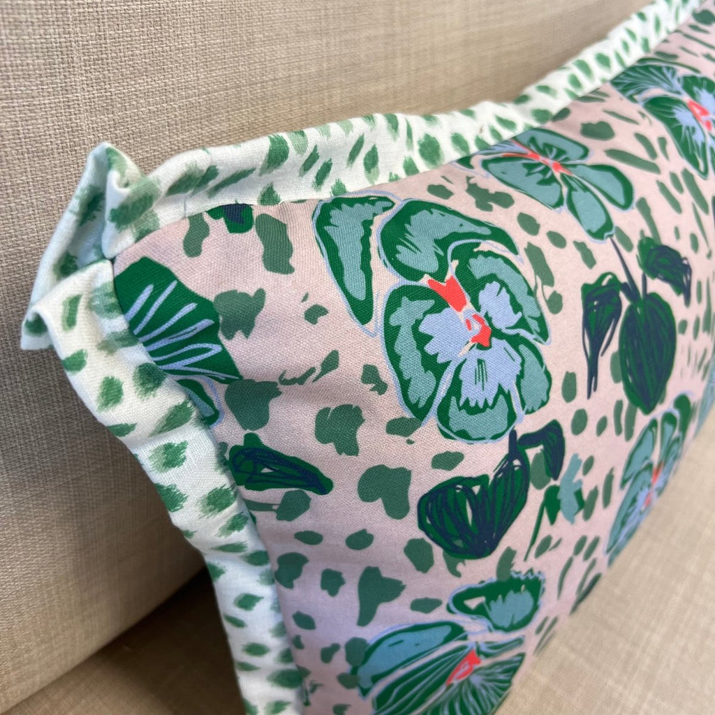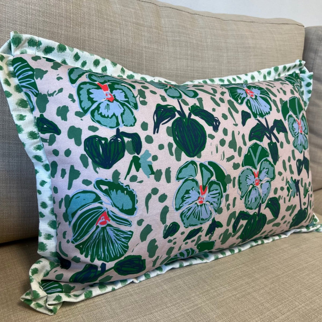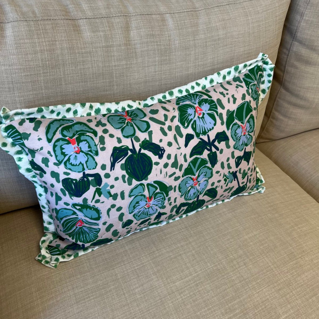 The lumbar cover is in Lulie Wallace Alice - front only w/ Jungle Ikat back and flange. The example pillow uses a 14x22" insert (sewn 12x20).