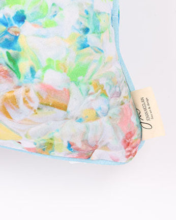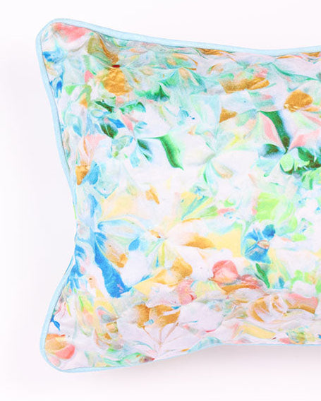 This luxurious pillow is hand crafted from shimmering velvet that catches the light with every movement, creating a soft, iridescent glow. Its design is elegantly intricate, featuring a pattern on both sides from the original painting called the Le Reve. The combination of velvety softness and the dual-sided design and baby blue cording makes this pillow a statement piece, inviting both comfort and sophistication into any space. Made in the US. Each design will vary in their own unique creation.