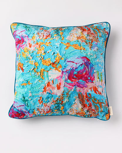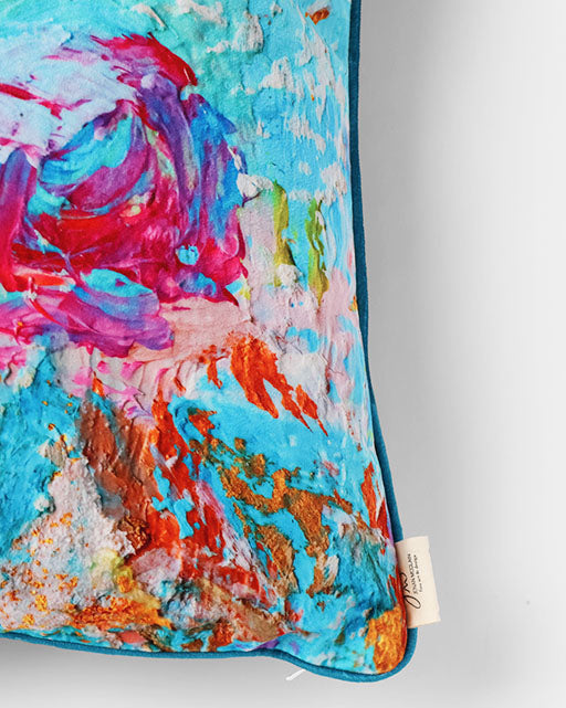 This luxurious pillow is hand crafted from sumptuous, shimmering velvet that catches the light with every movement, creating a soft, iridescent glow. Its design is elegantly intricate, featuring a pattern on both sides from the original painting inspired from the original painting called Our Little Angel. The rich teal cording that trims the edges provides a refined contrast, enhancing the pillow's opulence. The combination of velvety softness, the dual-sided design, and the delicate teal trim makes this pillow a statement piece, inviting both comfort and sophistication into any space. Made in the US. Each design will vary in their own unique creation.