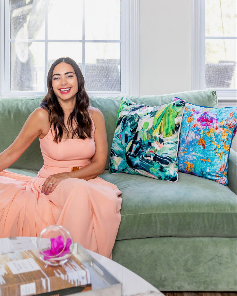 This luxurious 20 x 20 pillow is hand crafted from shimmering velvet that catches the light with every movement, creating a soft, iridescent glow. Its design is elegantly intricate, featuring a pattern on one side from the original painting inspired from the original painting called Our Little Angel. The rich teal is on the back of the pillow as well as the teal cording that trims the edges provides a refined contrast, enhancing the pillow's opulence. The combination of velvety softness, the intricate design, and the delicate gold trim makes this pillow a statement piece, inviting both comfort and sophistication into any space. Made in the US. Each design will vary in their own unique creation.