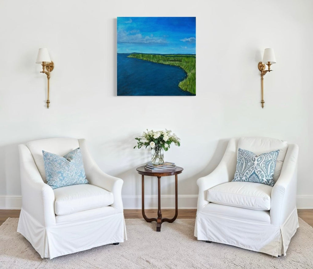 Unframed, gallery wrapped canvas, 1.5" deep, painted around sides, wired for hanging.