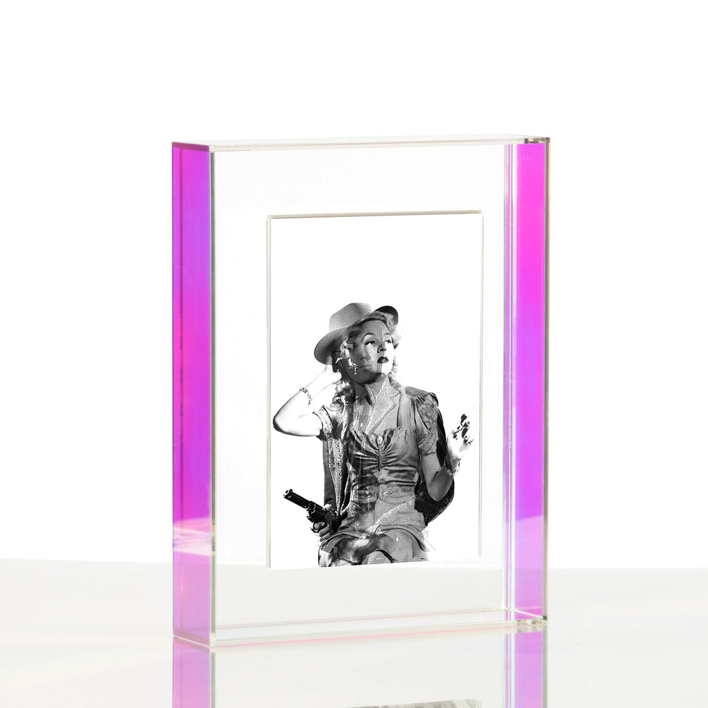 Capturing dynamic movement with this series of Lenticular photographs by B Shawn Cox. These powerful images layer vintage burlesque dancers with old-time cowboys framed in our modern floating wall frames with gold or silver hardware. Wexel Art juxtaposes vintage imagery that has dynamic movement with our contemporary framing.
