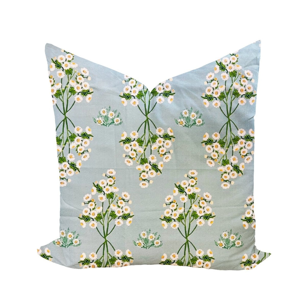 One decorative pillow cover featuring a floral/botanical design on home decor weight fabric by artist Lulie Wallace.